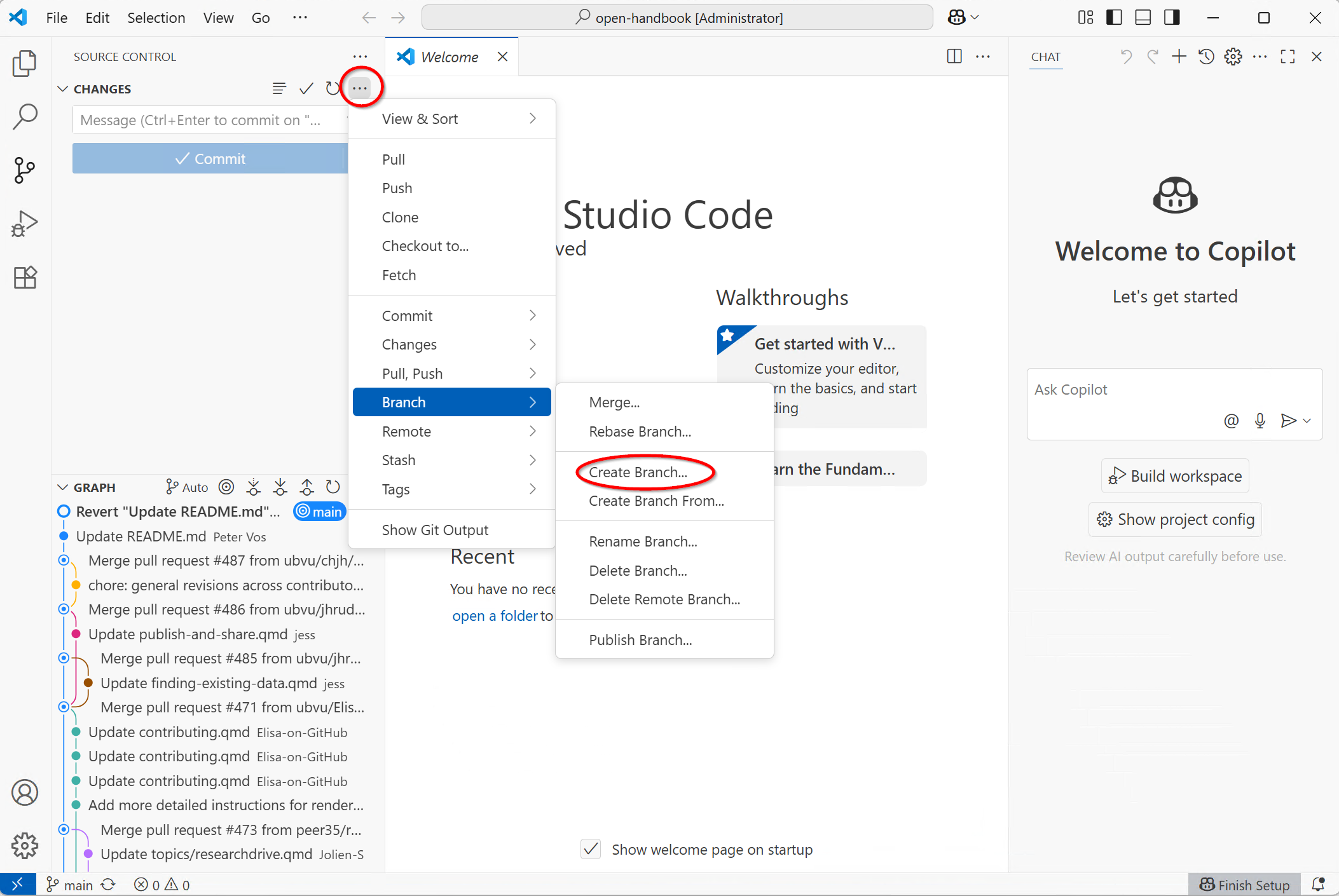 If you are planning to make multiple contributions to the Handbook, working in the GitHub web interface can get cumbersome. In that case we suggest you use an IDE (Integrated Development Environment) to create and edit pages. An IDE is a text editor that has lots of extra functionalities for developers, such as integration with Git. VS Code is a widely used, free, IDE and it is very well suited to edit Markdown files and has integrated Git & GitHub support. This allows you to work on your edits on your laptop whenever you want, preview them using the Quarto client and Push your changes to GitHub. No special knowledge of the Git Commandline is necessary.