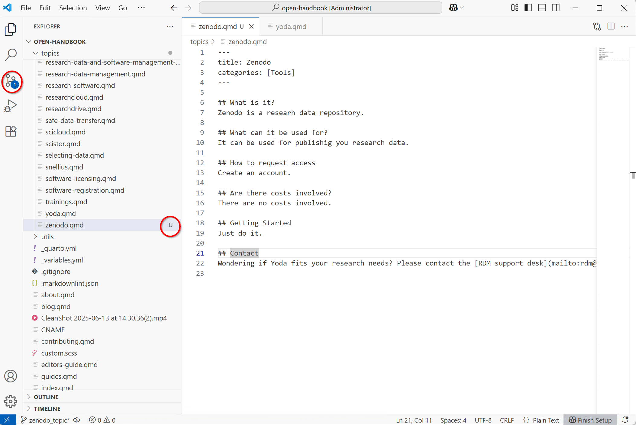 Remember your changes are tied to the branch. If you would switch from the zenodo_topic branch to the main branch you will no longer see the changes you made to the Zenodo topic page. But if you have committed your changes they will be visible again once you switch back.