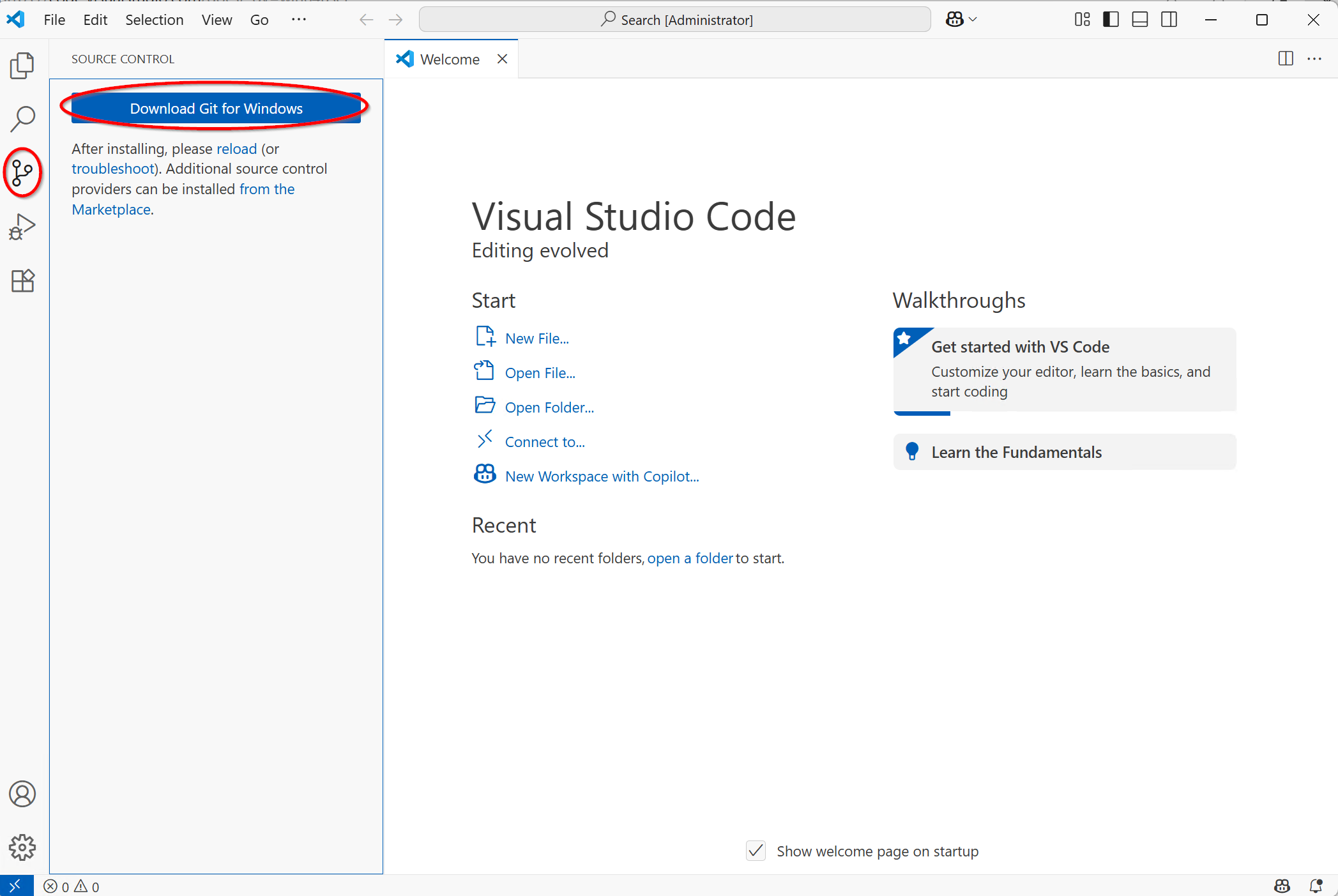 - Open VS Code and click on the Git icon on the left. If you do not have Git installed you can do so from here, the download button will lead you to https://git-scm.com/downloads, you do not need the GUI client.