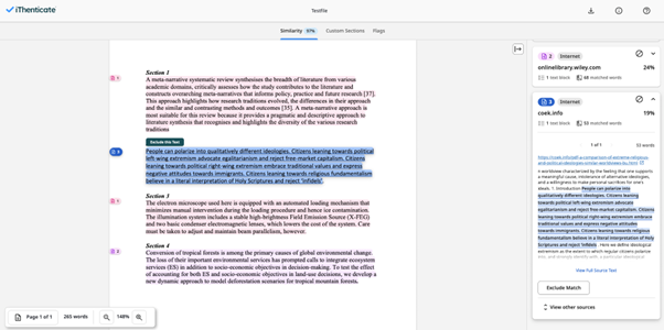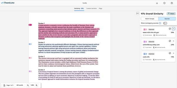 A detailed view of the similarities found by iThenticate can be accessed by clicking on the file title. The texts that are found similar to online sources are highlighted with different colours, each colour corresponding to a different source. The sources of the similarities can be found on the right side of the screen. By clicking on a source (right side of the screen) or the highlighted text (left side of the screen) a drilldown to the source can be made, as well the location of the specific text within the source.